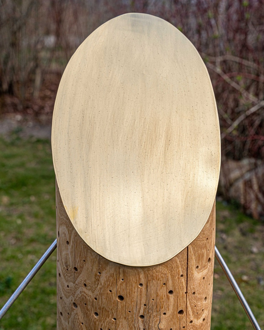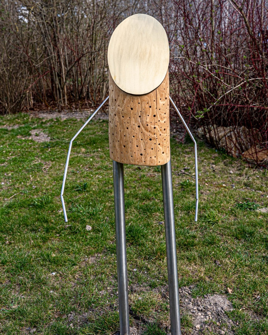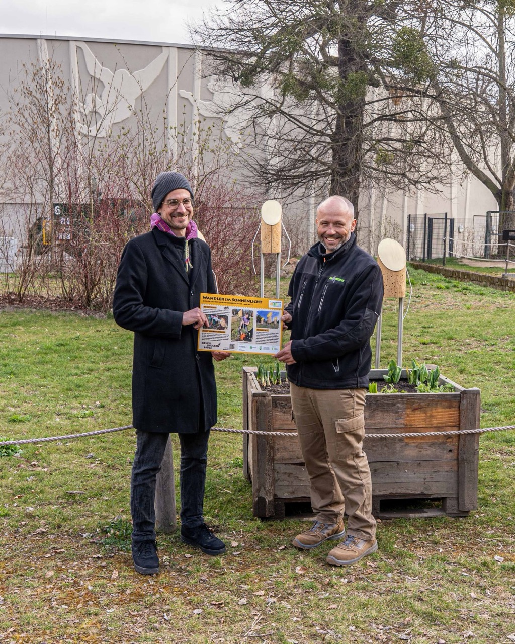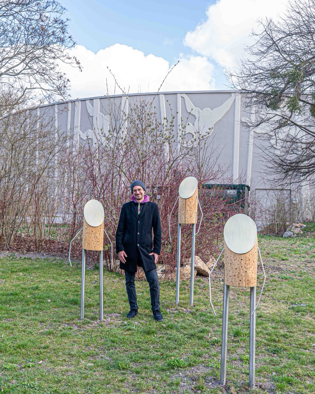 🪵 Der erste von drei Gewinnern ist das Kunstwerk »Wandler im Sonnenlicht« von Ulrich Stolz und steht nun im Zoo Dresden: Drei Figuren aus Robinienstämmen und Stahlrohren wandeln wie stille Begleiter durch eine Blumenwiese. Ihre goldenen Messinggesichter fangen das Sonnenlicht ein und schützen zugleich die darunter liegenden Nistgänge.